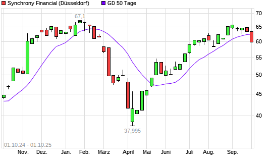 Mit dem Rücksetzer auf 62,15 EUR hat die Synchrony Financial-Aktie am 30.09.2025 die 50-Tage-Linie nach unten gekreuzt.Die Synchrony Financial-Aktie befindet sich seit dem 24.06.2025 im ...weiterlesen
