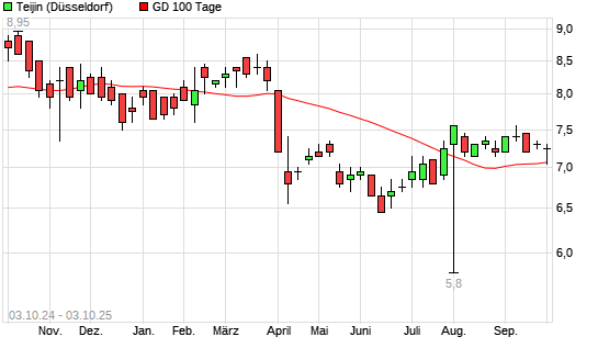 Mit dem Anstieg auf 7,20 EUR hat die Teijin-Aktie am 02.10.2025 die 100-Tage-Linie nach oben gekreuzt.
