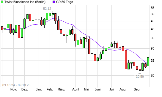 Mit dem Anstieg auf 24,69 EUR hat die Twist Bioscience-Aktie am 02.10.2025 die 50-Tage-Linie nach oben gekreuzt.