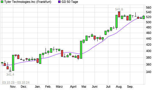 Mit dem Anstieg auf 526,80 EUR hat die Tyler Techs-Aktie am 02.10.2024 die 50-Tage-Linie nach oben gekreuzt.