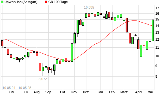 Mit dem Rücksetzer auf 13,65 EUR hat die Upwork-Aktie am 09.05.2025 die 100-Tage-Linie nach unten gekreuzt.