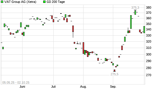 Mit dem Anstieg auf 345,80 EUR hat die VAT GROUP AG-Aktie am 01.10.2025 die 200-Tage-Linie nach oben gekreuzt.