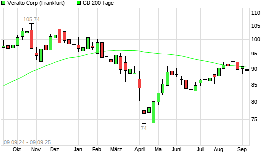 Mit dem Rücksetzer auf 88,91 EUR hat die VERALTO-Aktie am 08.09.2025 die 200-Tage-Linie nach unten gekreuzt.