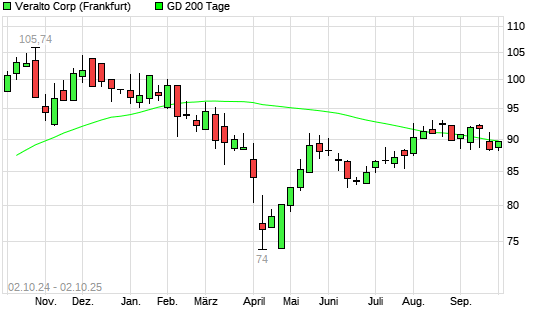 Mit dem Anstieg auf 89,63 EUR hat die VERALTO-Aktie am 01.10.2025 die 200-Tage-Linie nach oben gekreuzt.Die VERALTO-Aktie befand sich seit dem 22.09.2025 im langfristigen Aufwärtstrend und hat ...weiterlesen