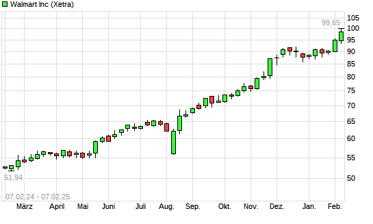 Mit dem Anstieg auf 98,62 EUR hat die Walmart-Aktie (ISIN US9311421039) am 06.02.2025 ein neues All-Time-High erreicht und damit den Kurs vom 05.02.2025 eingestellt.