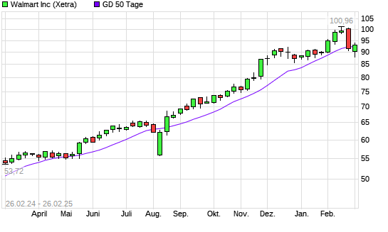 Mit dem Anstieg auf 92,48 EUR hat die Walmart-Aktie am 25.02.2025 die 50-Tage-Linie nach oben gekreuzt.
