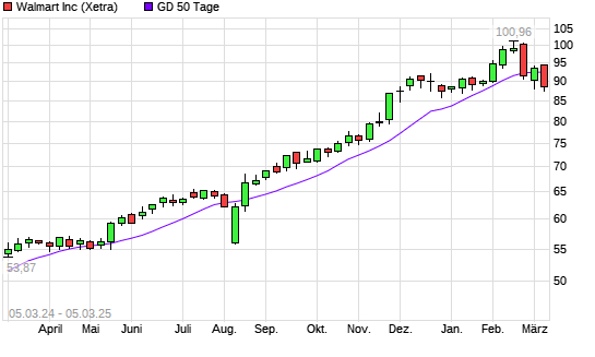 Mit dem Rücksetzer auf 90,37 EUR hat die Walmart-Aktie am 04.03.2025 die 50-Tage-Linie nach unten gekreuzt.