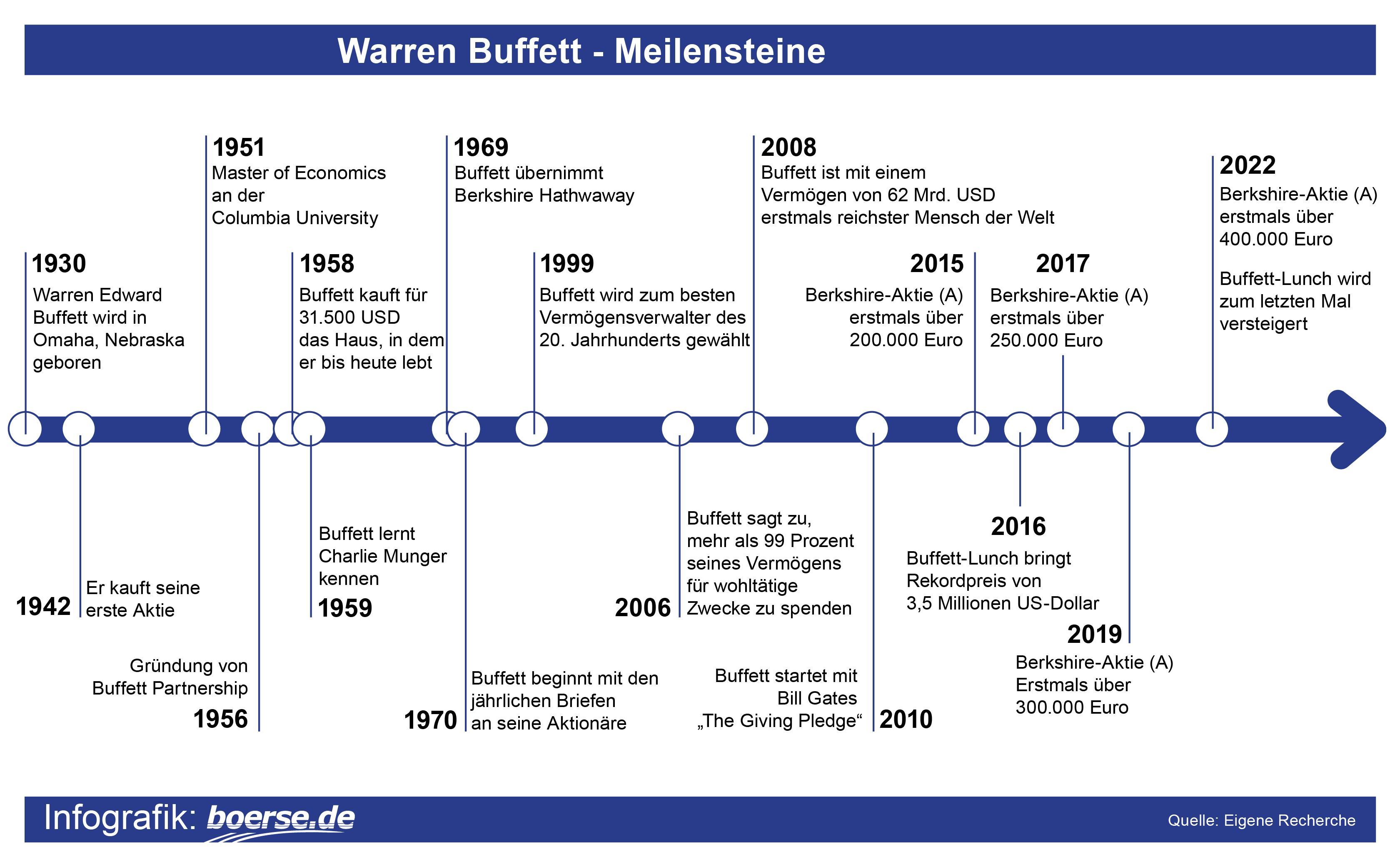 1956, im Alter von 25 Jahren, folgte mit der Gründung des Unternehmens Buffett-Partnership der Schritt in die Selbständigkeit. Neun Jahre später wurde für die Partnership auch die Mehrheit an der damaligen Textilfirma Berkshire Hathaway erworben. Als Buffett die Partnership im Jahr 1969 auflöste, konnten die Anteilseigner entweder aussteigen oder ihre Anteile zum Kurs von 43 US-Dollar je Stück in Aktien von Berkshire Hathaway umtauschen, die zu einer Holding-Gesellschaft umgebaut werden sollte. Heute ist Berkshire Hathaway (A) die teuerste Aktie der Welt mit einem 6-stelligen Aktienkurs.